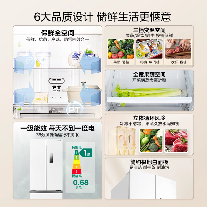 美的508法式双系统多门净味四门双循环无霜一级大容量家用冰箱