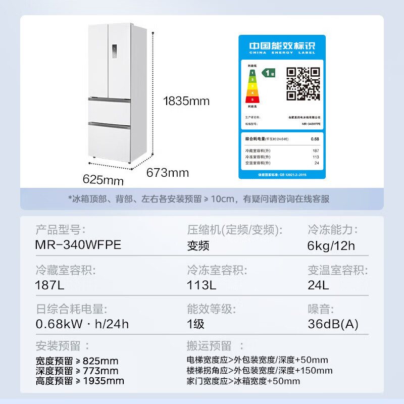 美的冰箱340小户型法式多开双开四门白色家用风冷无霜一级节能