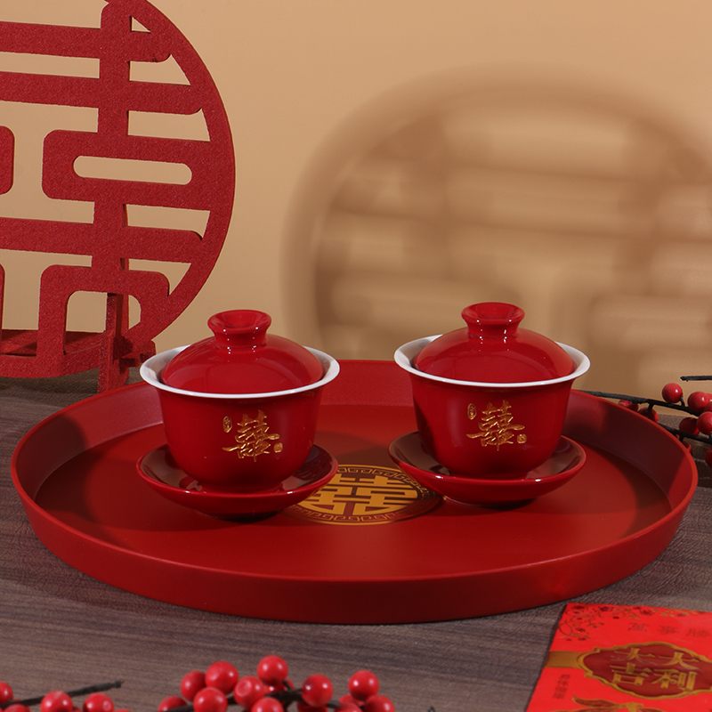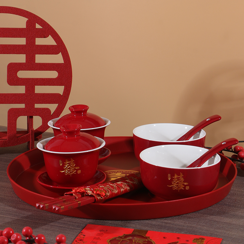 结婚敬茶杯套装陪嫁用品改口敬酒茶杯喜碗婚礼红色碗筷对碗婚庆