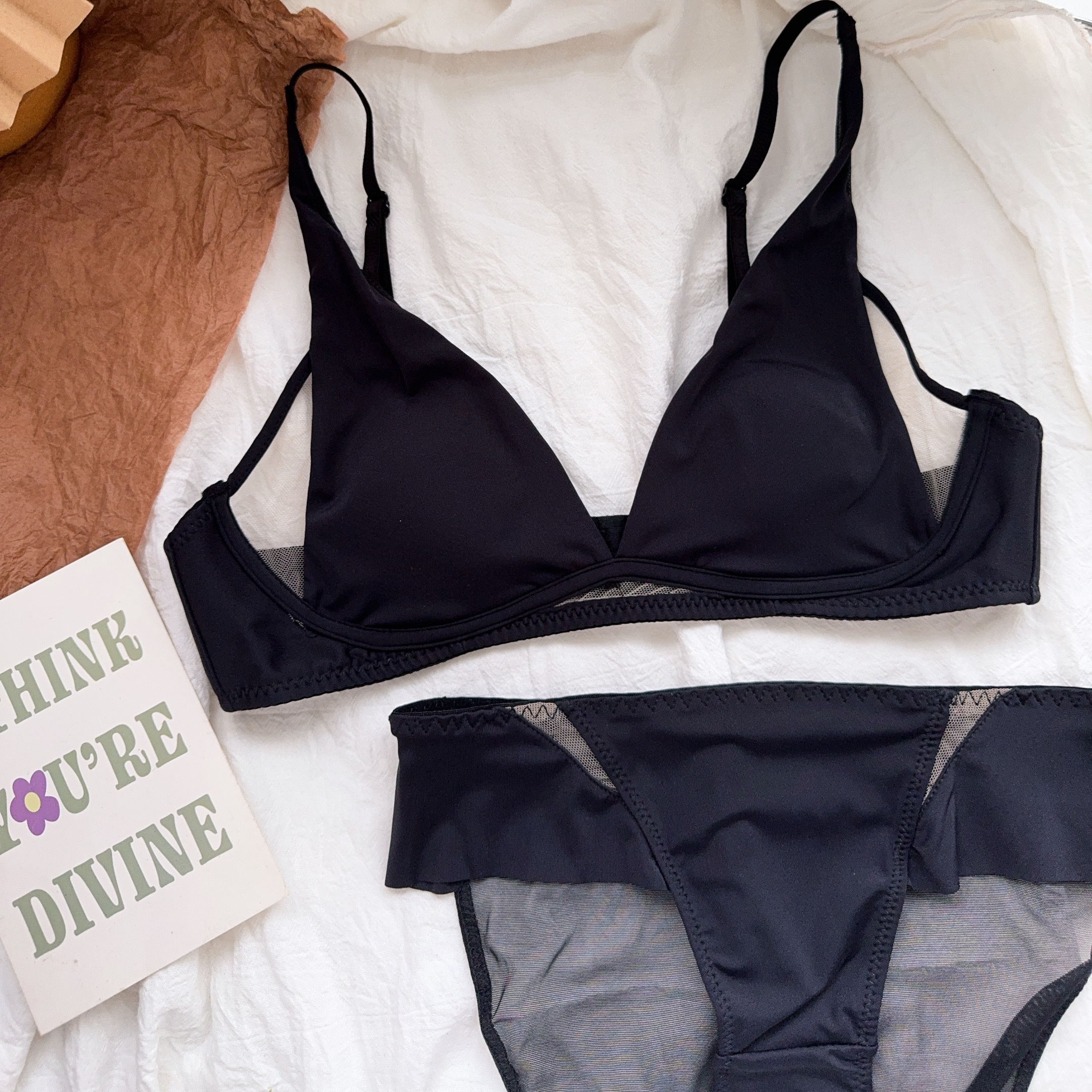 法式无痕三角杯内衣女夏薄款无钢圈舒适深v兔耳杯小胸文胸罩套装