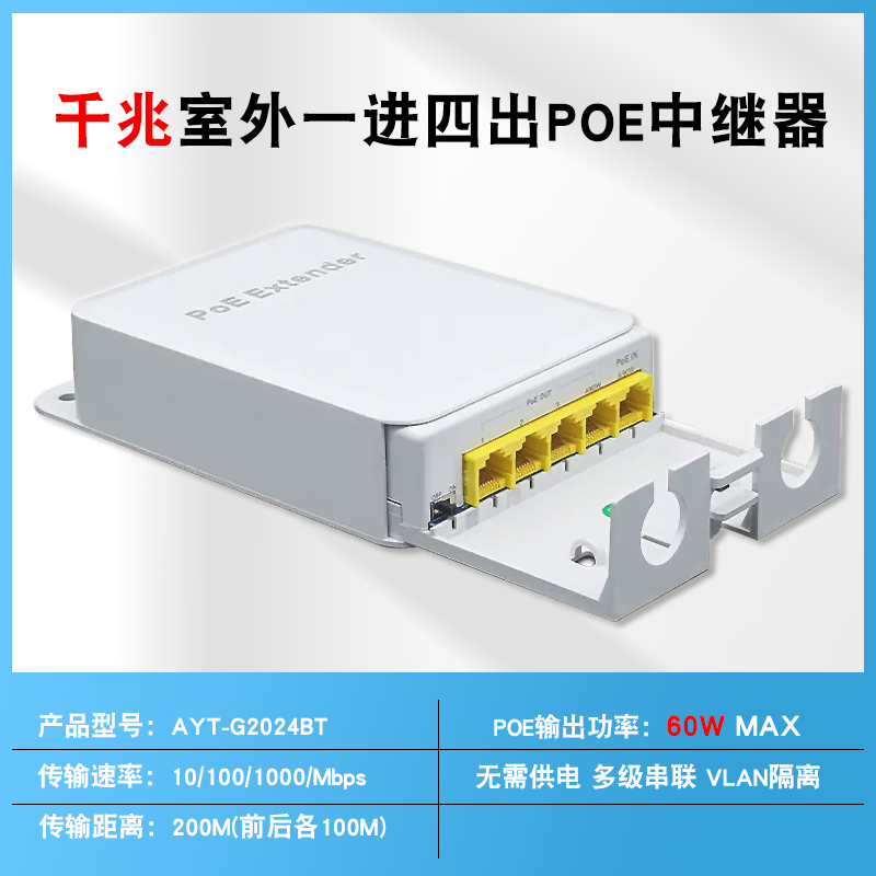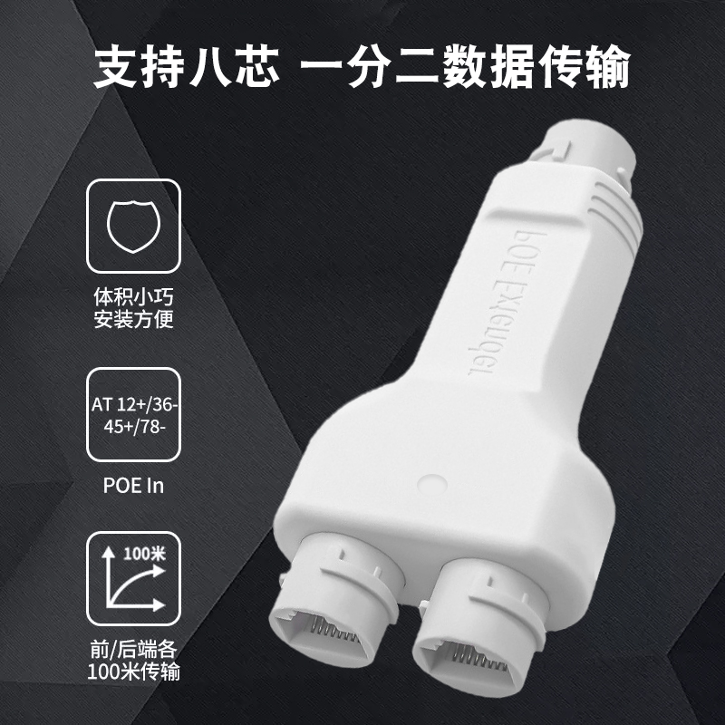 POE中继器一分二室外防雨水一分四百兆千兆标准POE交换机延长器串联网络供电监控摄像头一线通级联宝国标受电