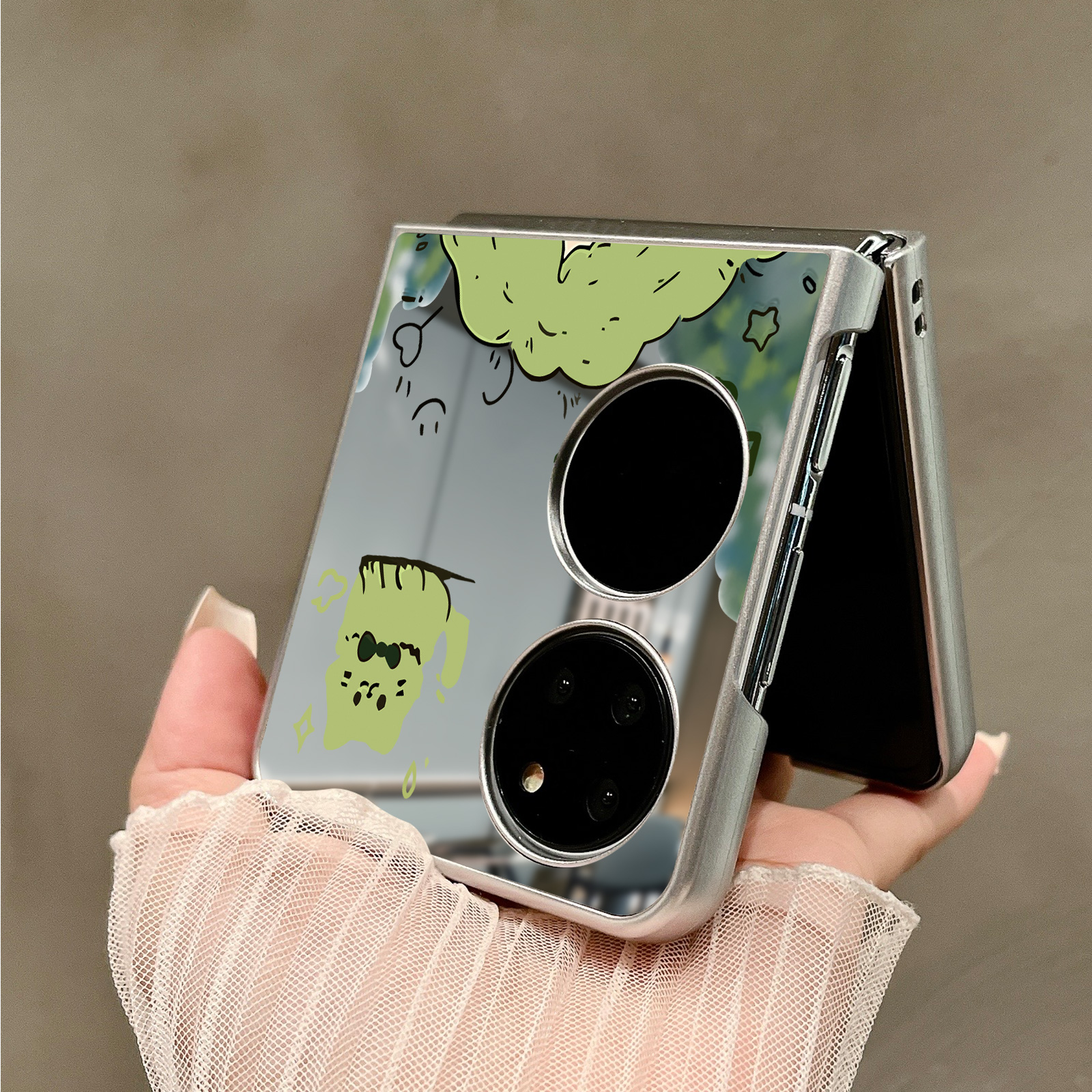 热瓜适用华为P50pocket手机壳Pocket2折叠屏保护套银色绿色蓬松小女孩镜面新款pockets高档翻盖视窗全包潮套