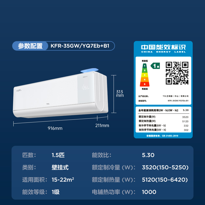 TCL新风空调大1.5匹新一级小蓝翼Q7冷暖柔风挂机变频家用
