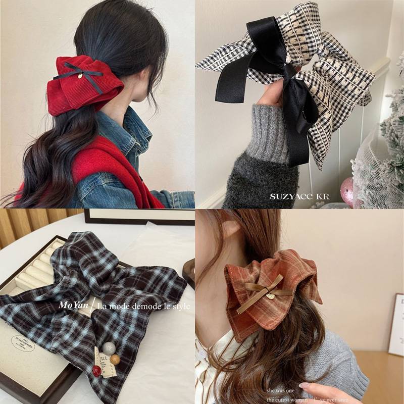 秋冬新款芭蕾风蝴蝶结大肠发圈女小众设计格纹方巾头绳丸子头发饰