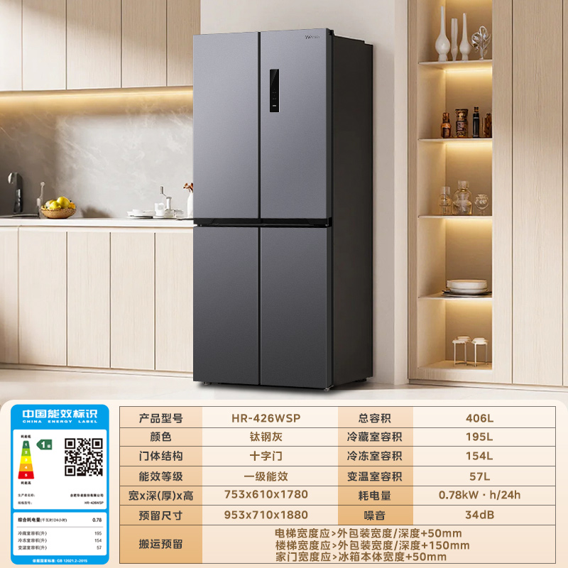 美的WAHIN426十字对开四门超薄嵌入一级能效家用变频风冷无霜冰箱