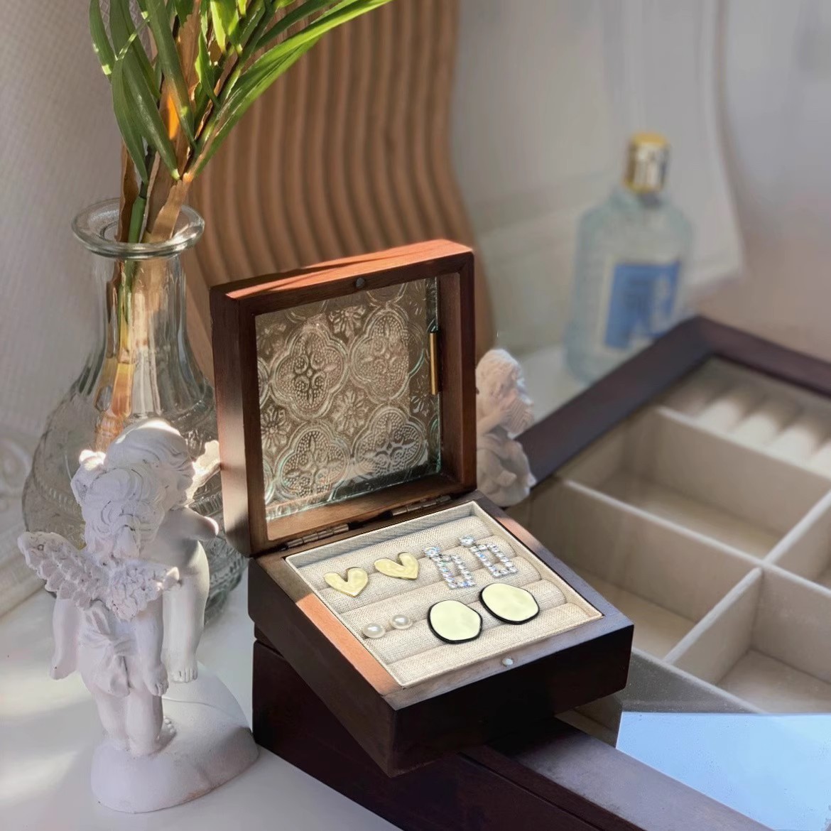 实木首饰盒双层女士珠宝首饰盒带镜子和戒指托盘的木制展示复古盒