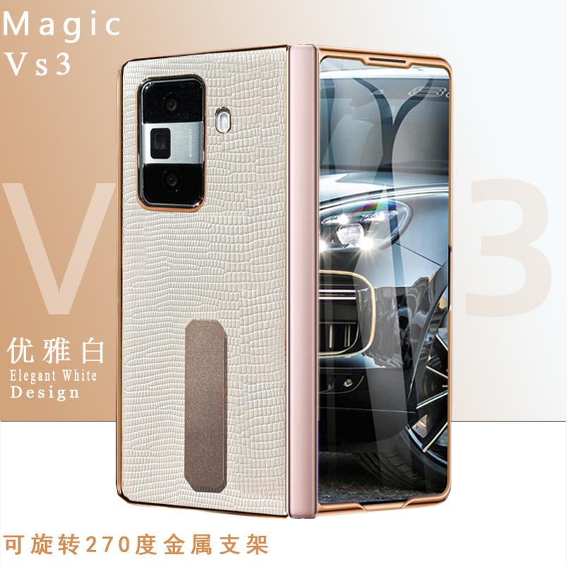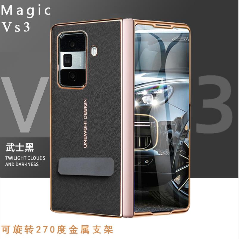 适用荣耀magicvs3手机壳电镀纳帕纹VS3新款Magic Vs3折叠屏保护套真皮秒变金属旋转支架外壳壳膜一体皮套