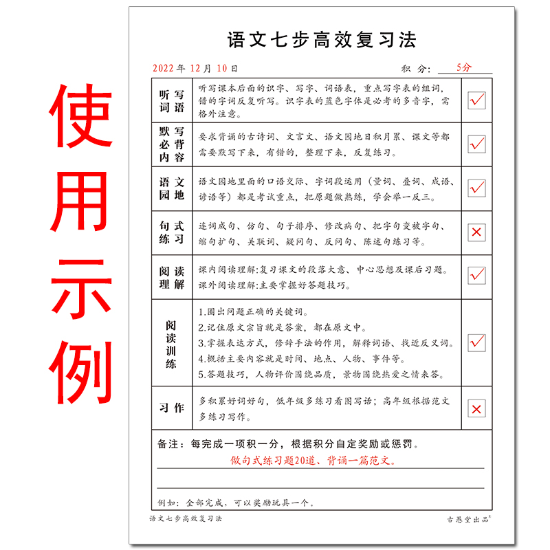 语文七步高效复习法小学生一年级二年级三年级四年级五年级六年级通用版听写词语句式练习阅读习作高效复习本