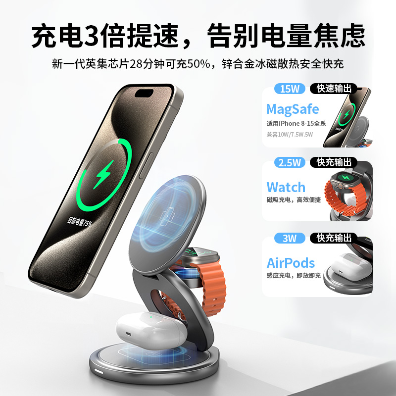 冠渠适用苹果16三合一无线充电器Magsafe磁吸iPhone15折叠手机支架耳机applewatch手表充电座AirPods旋转qi2