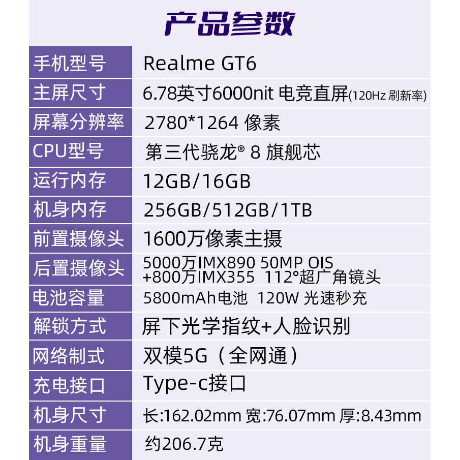 Realme/真我 GT6 第三代骁龙8 电竞无双直屏大电池性价比高5G手机