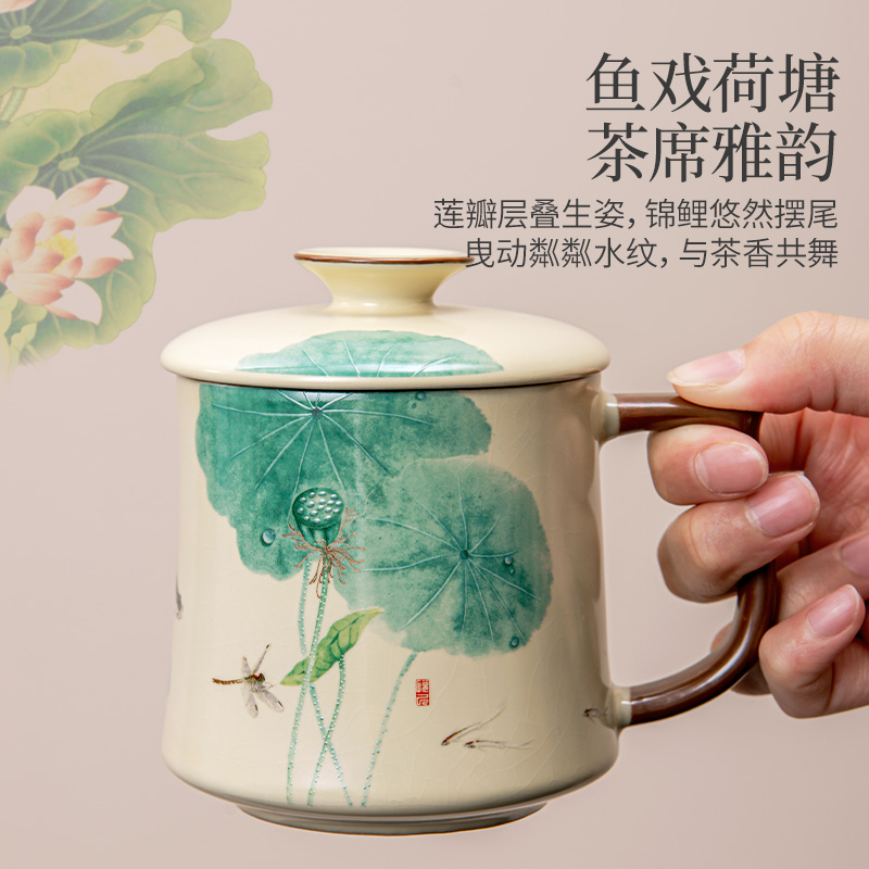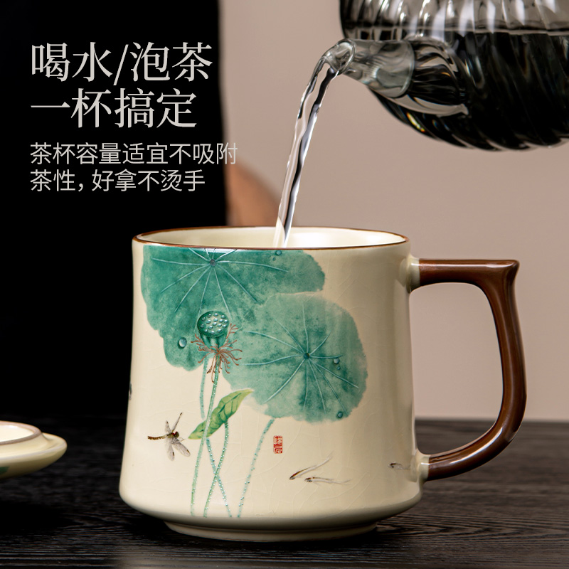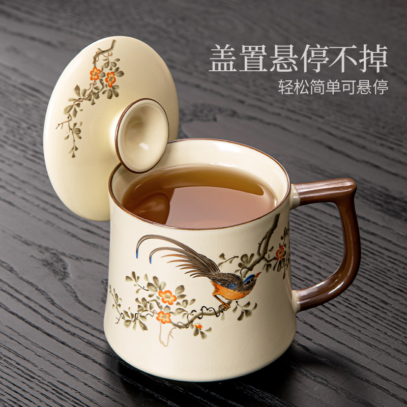 汝窑大容量办公杯高档中式家用带盖马克杯个人专用泡茶杯子礼盒装