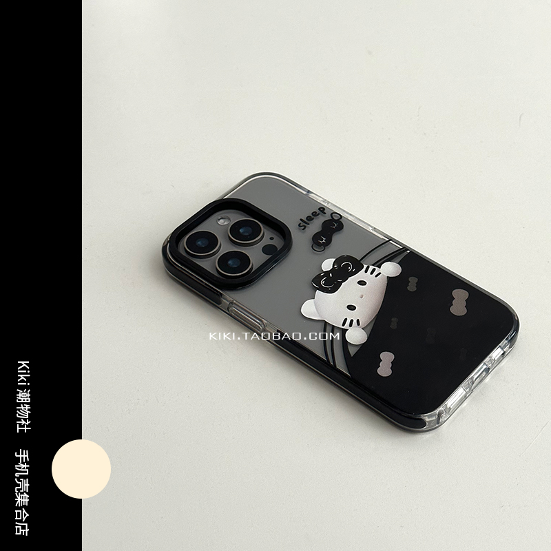 暗黑系黑蝴蝶结睡觉Kitty猫适用iphone17手机壳14黑边16Pro方孔防撞条13小众苹果12大方孔15高级感透明手机壳