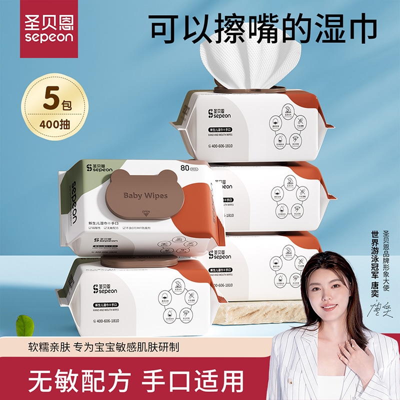圣贝恩婴儿湿巾纸新生宝宝手口专用屁幼儿童80抽5包家庭加厚大包