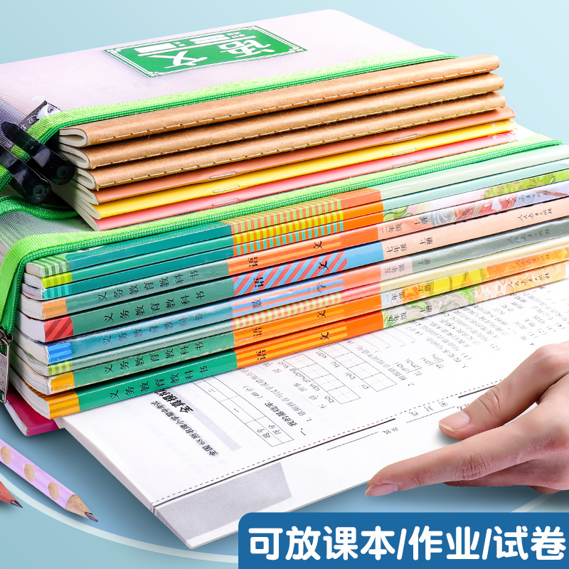 学科科目分类文件袋拉链双层大容量小学生用作业袋透明网纱A4资料袋语文分科书袋试卷收纳袋手提学生学习补习