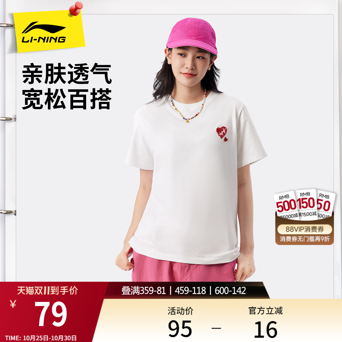 李宁短袖女士夏季2025新款爱心宽松上衣休闲印花T恤女针织运动服