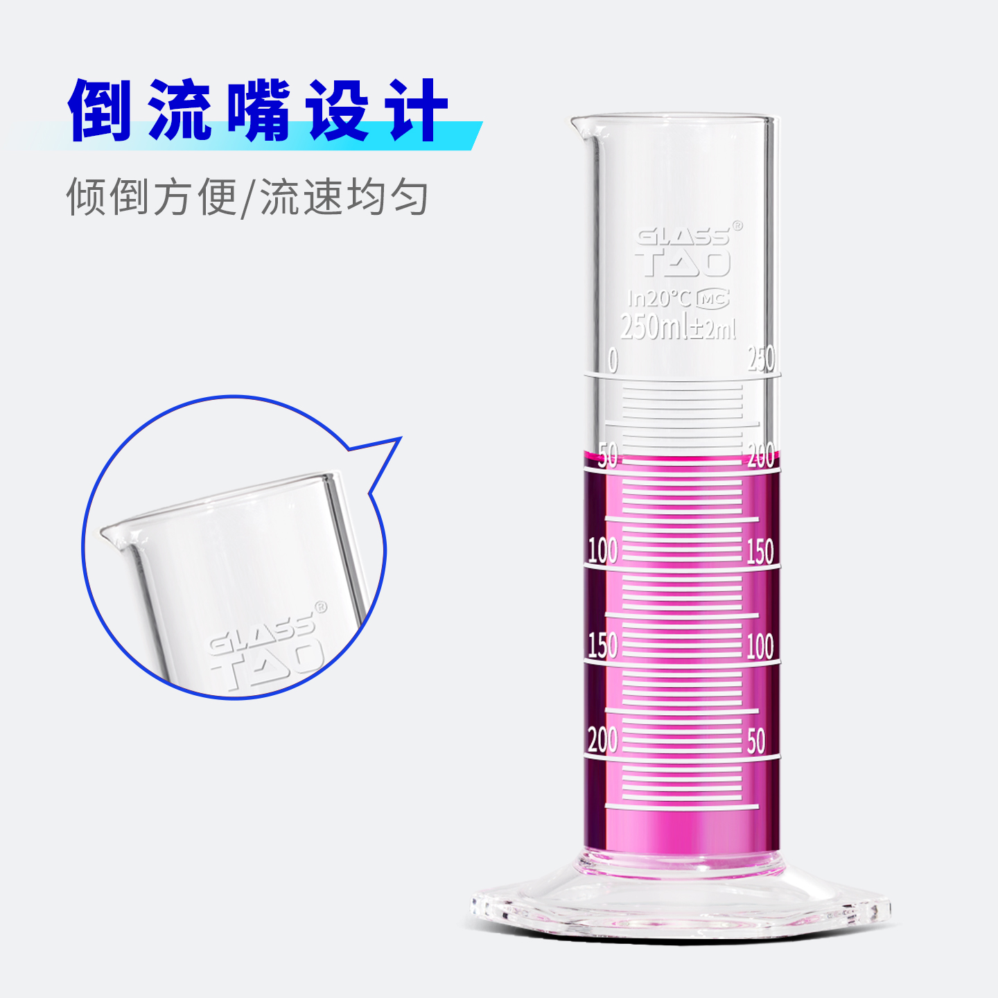 GLASSTAO格拉斯陶 六角底矮型玻璃量筒 化学实验室器材高硼硅玻璃耐酸耐碱刻度清晰透明度高50/100/250/500ml