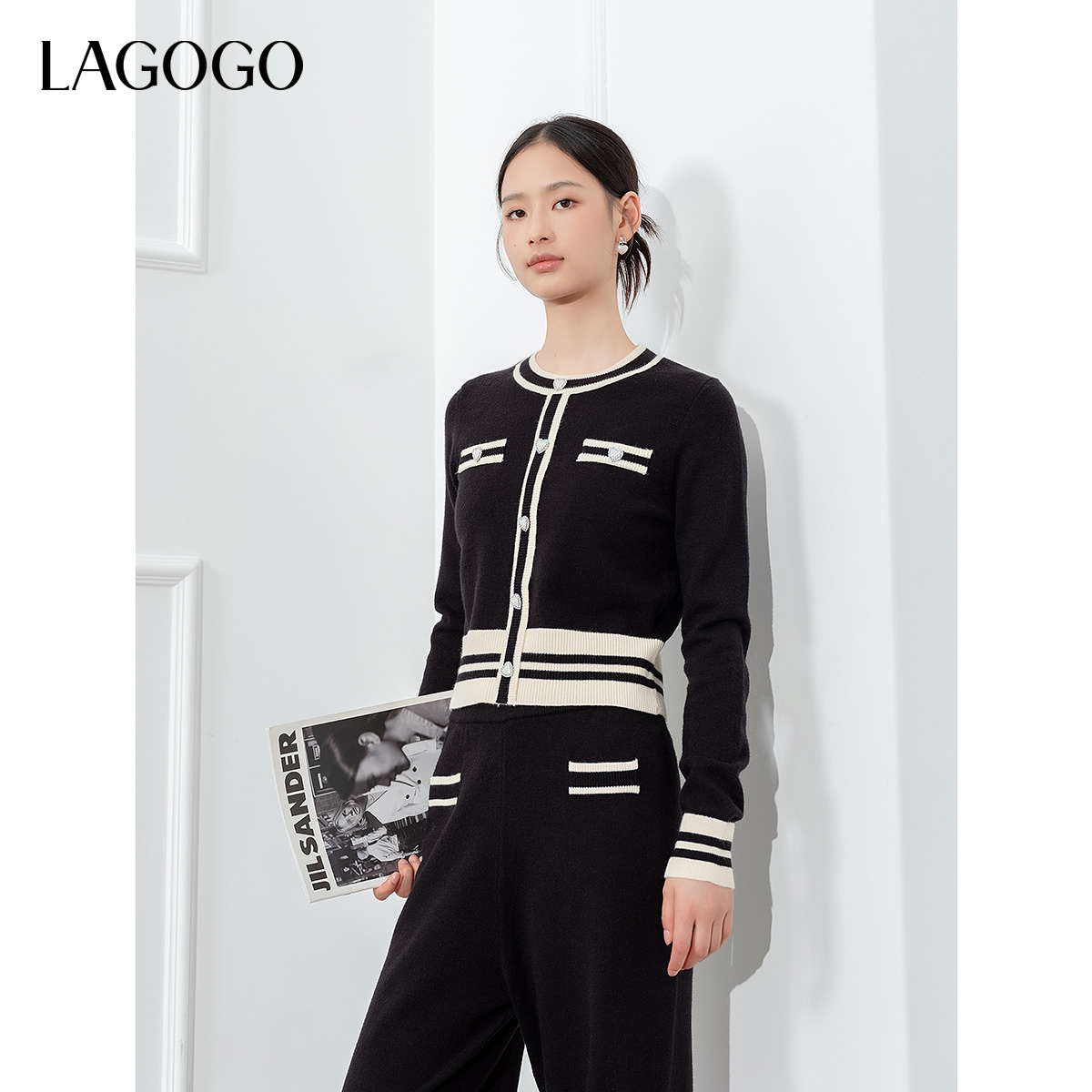 LAGOGO温柔撞色小香风毛针织衫女拉谷谷春秋新款套装高腰舒适套装