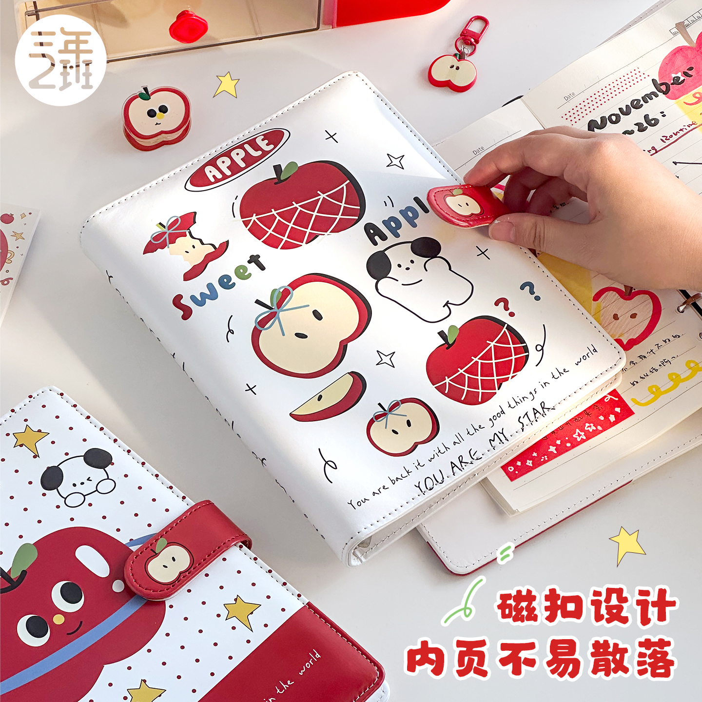 三年二班 小狗爱吃苹果卡册皮面活页笔记本本子手账本高颜值日记本可爱初高中生计划本记事本2025开学习学生K