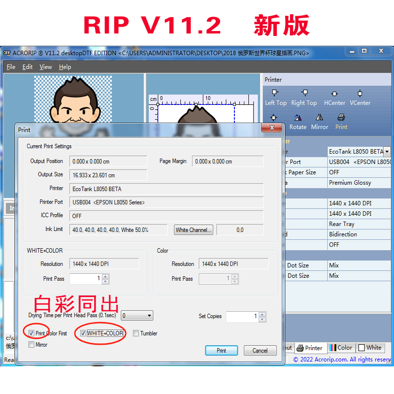 DTFRIPV11.2柯式烫画白彩同出软件L18058 8058打印机白墨烫画软件