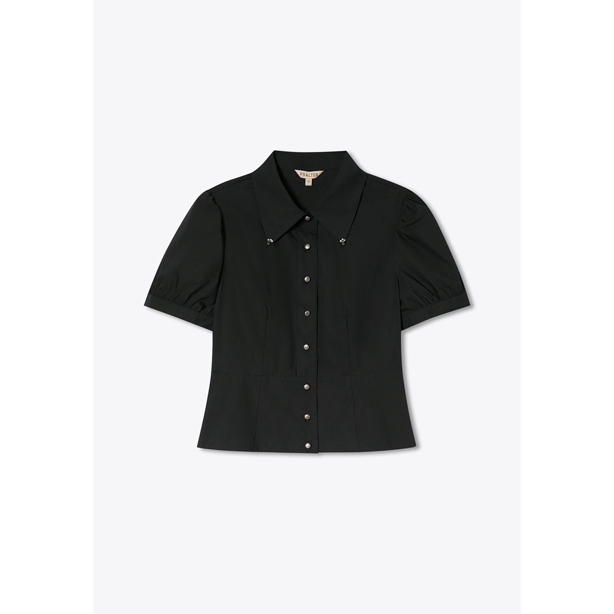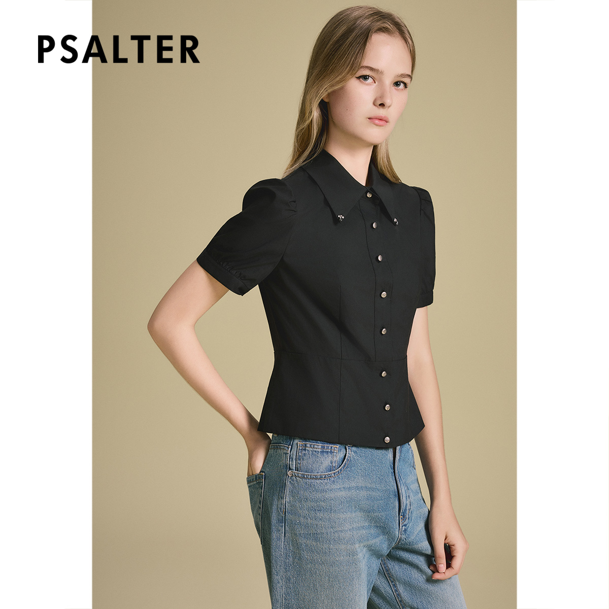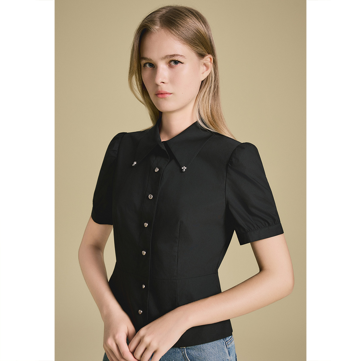 诗篇专选方角钉珠翻领泡泡袖收腰修身衬衫女2025夏季新款