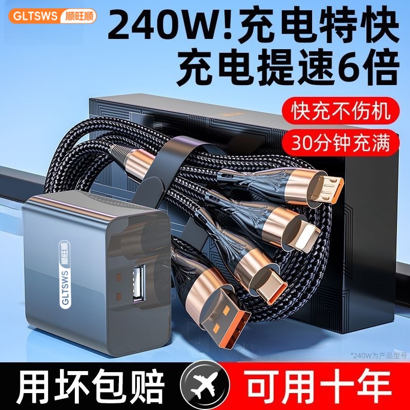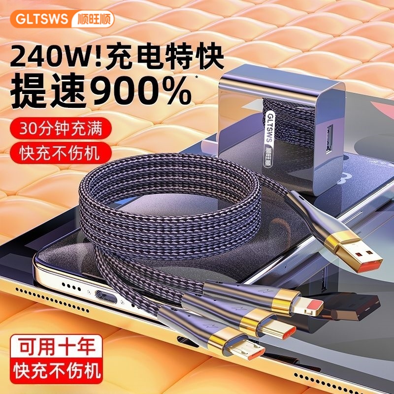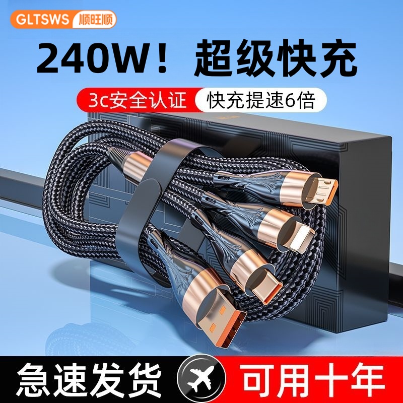 240W超级三合一快充充电线数据线充电器一拖三USB充电头多功能三头套装适用苹果安卓手机耳机风扇通用插头