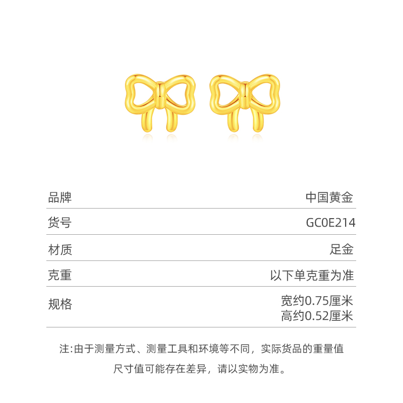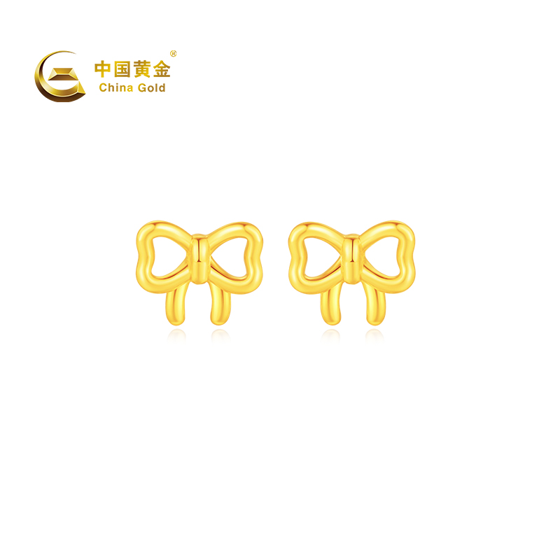 【中国黄金官方店】足金光面简约蝴蝶结直针耳饰时尚简约蛇年新品