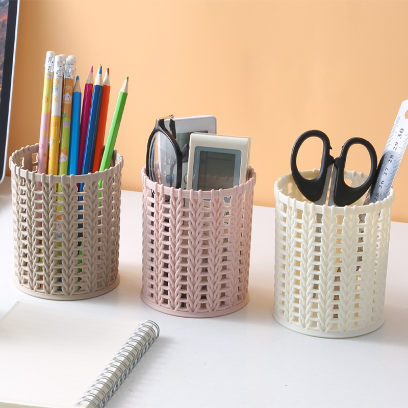 简约小清新创意藤编塑料笔筒多功能镂空桌面文具圆形化妆工具收纳