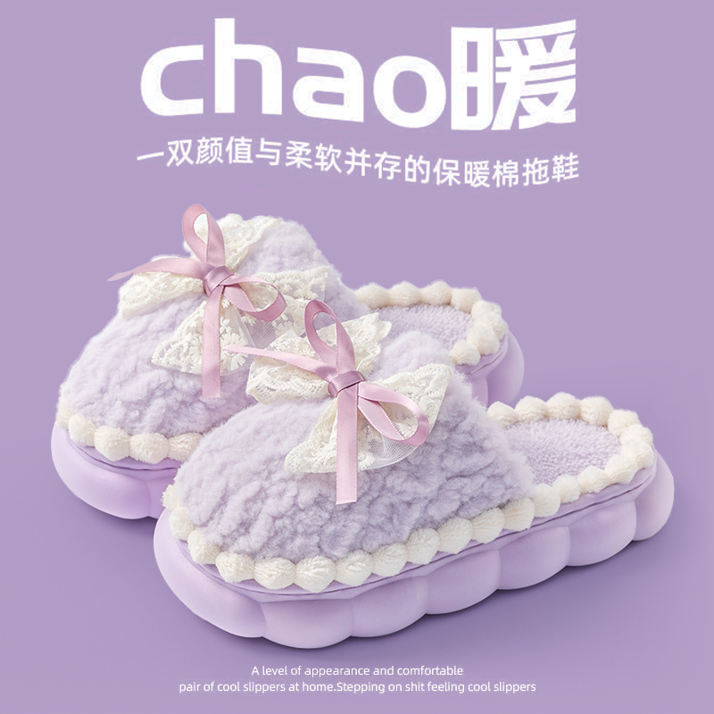 秋冬季棉拖鞋家居室内加绒保暖厚底防滑月子鞋女蕾丝蝴蝶结棉拖鞋