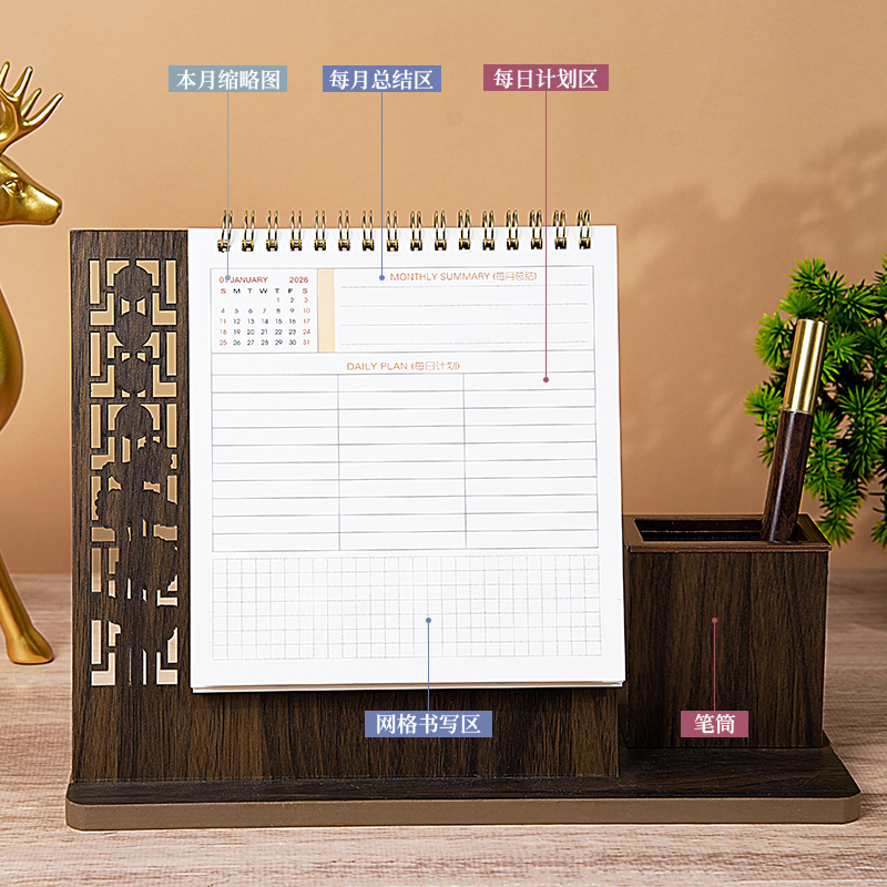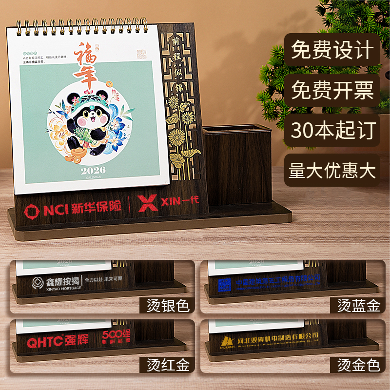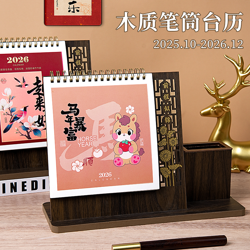 得将 2026年镂空木质中式国风插画台历简约大气笔筒礼盒日历桌面摆件支持学校企业定制logo