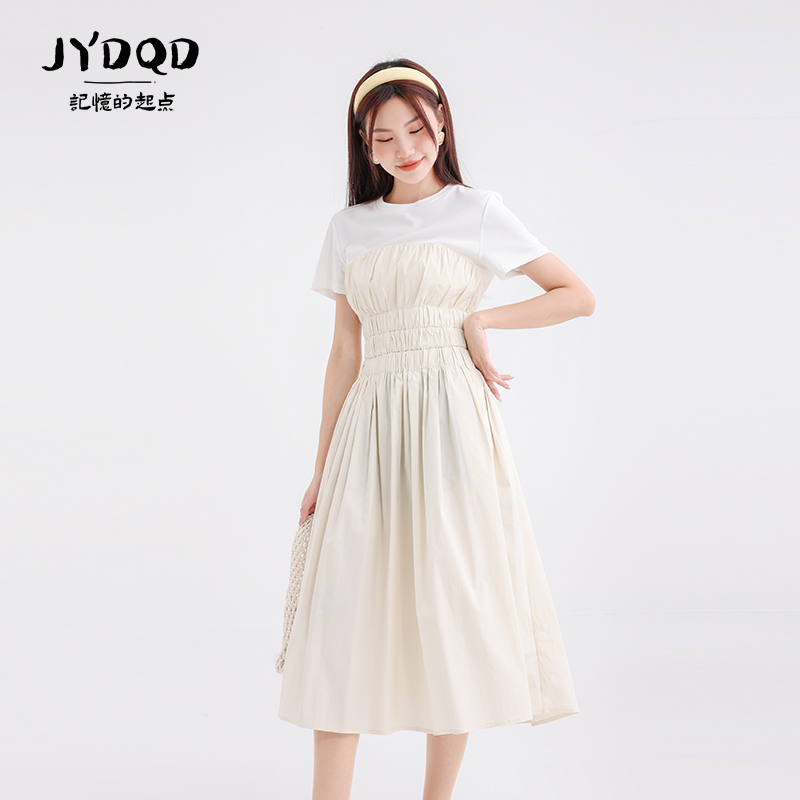 记忆的起点连衣裙2023夏小心机设计感褶皱露腰拼接长裙67TX83996