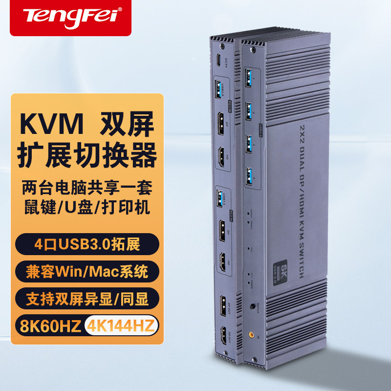 腾飞hdmi+dp kvm切换器双屏二进二出8K超清4K144Hz高刷两台电脑切换使用两个显示器usb3.0共享键盘鼠标共享