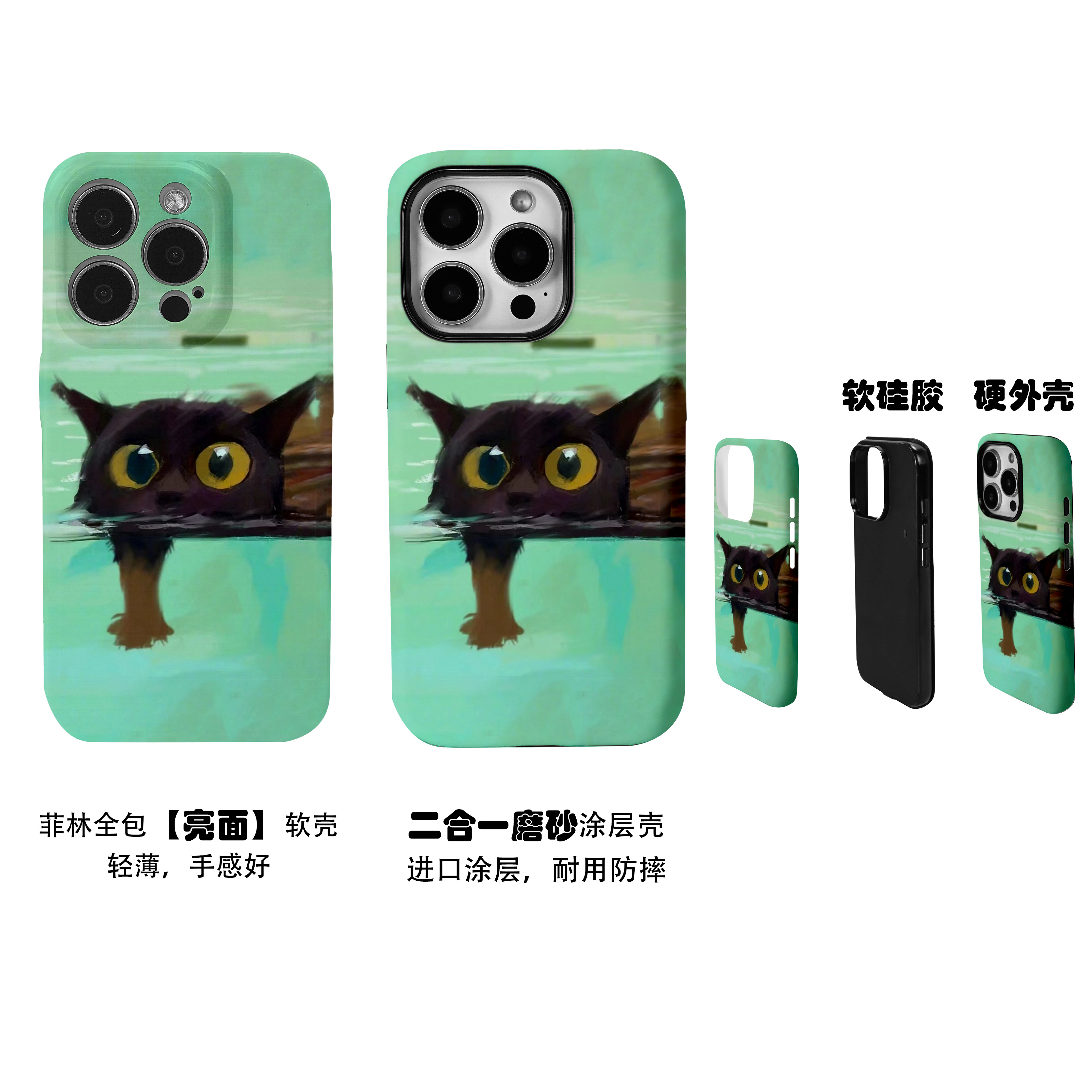 薄荷绿可爱无辜的小黑猫菲林二合一手机壳适用苹果17nova14华为p70mate60小米15opporen14荣耀300iPhone16