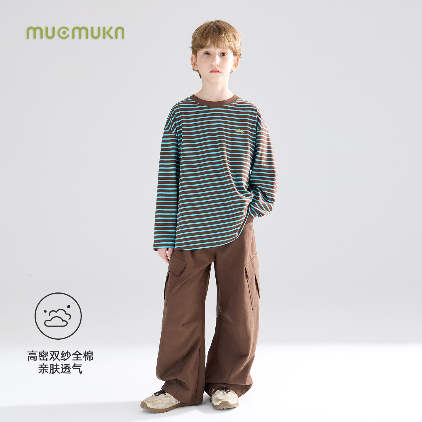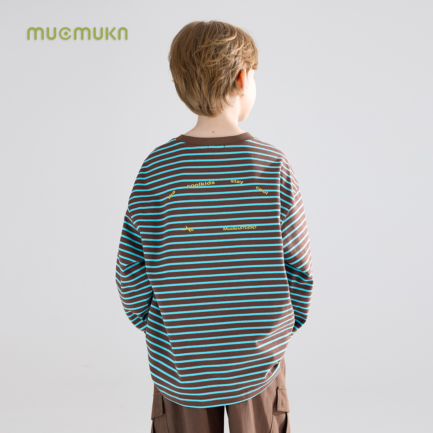 【奥巧松饼】美式复古条纹T恤100%全棉撞色领长袖打底男童秋新款