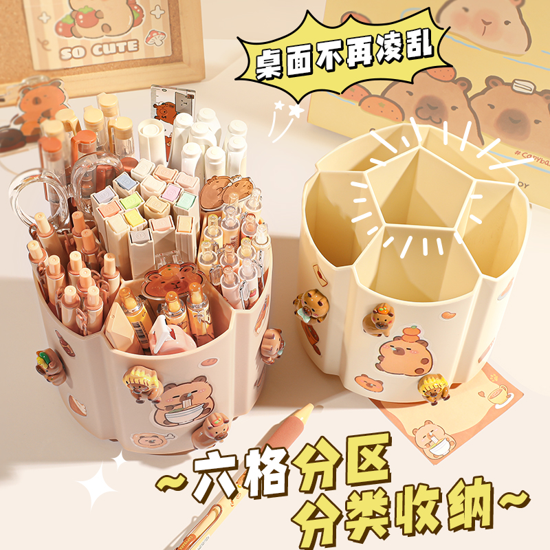 卡皮巴拉笔筒创意可爱旋转笔桶多功能diy办公室桌面收纳盒大容量超大学生儿童男女孩化妆刷收纳轻奢高级感ins