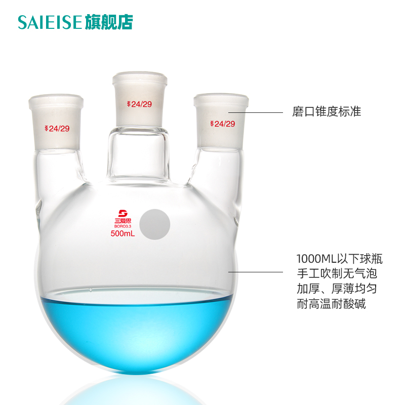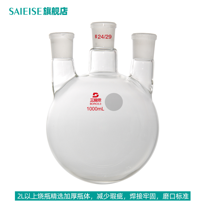 SAIEISE直三口烧瓶50 100 250 3000ml-20L白色耐高温厚壁圆底蒸馏反应釜高硼硅实验室玻璃器材仪器皿科学用品