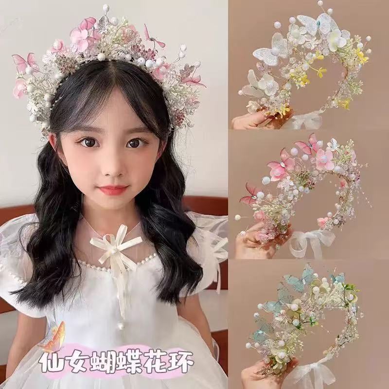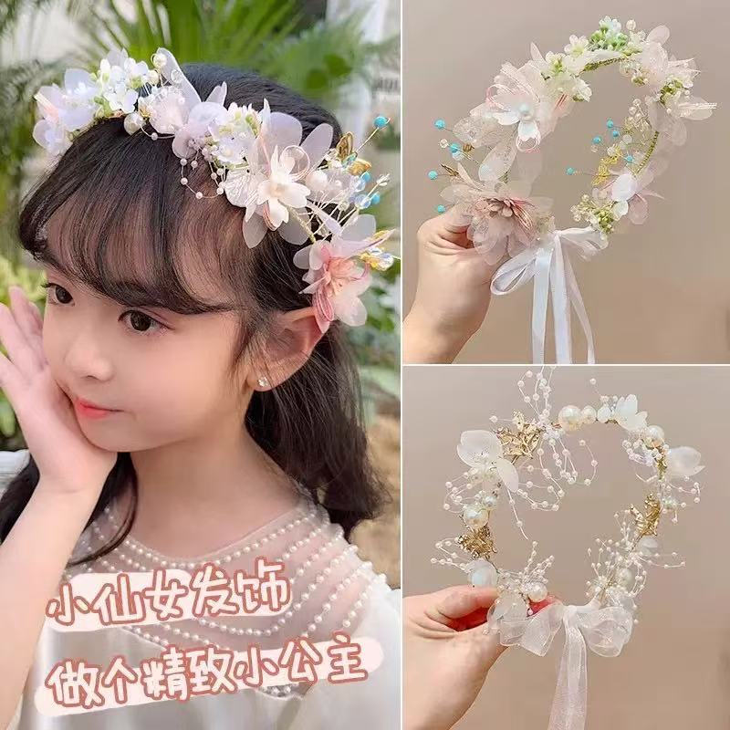 儿童花环公主发饰女孩超仙花朵珍珠飘带头饰花童网红发箍蝴蝶仙气