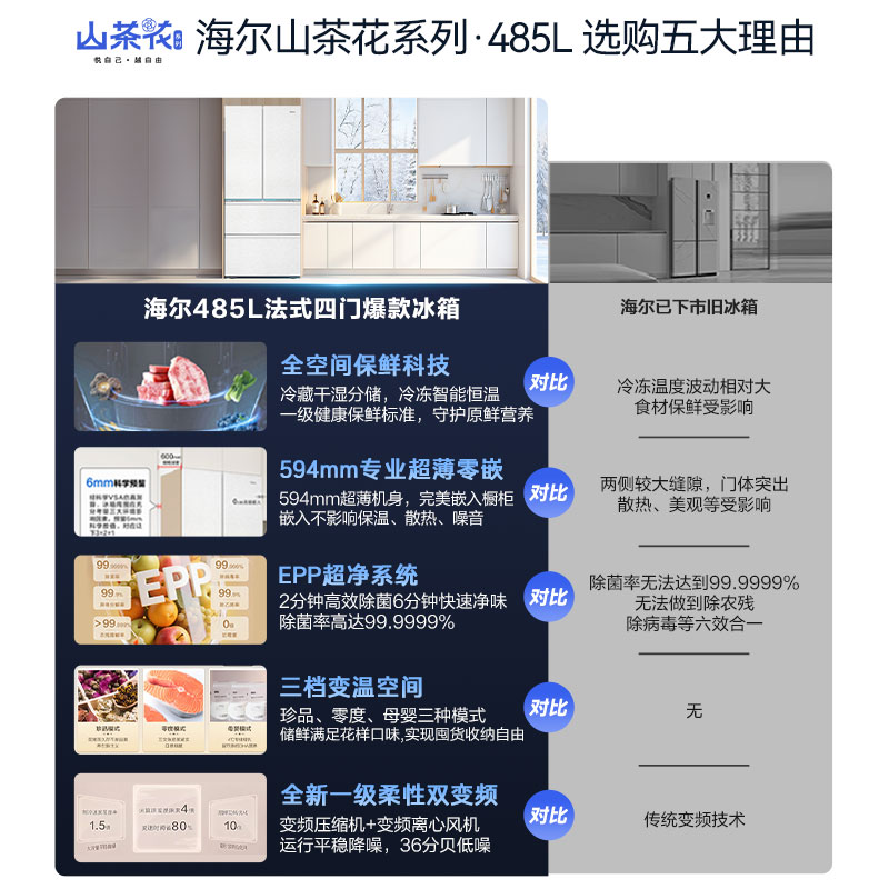 政府换新补贴海尔山茶花485L零嵌入式法式一级大容量风冷无霜冰箱