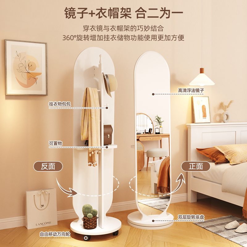 旋转全身镜子带置物挂衣架一体设计感可移动角落小户型穿衣落地镜
