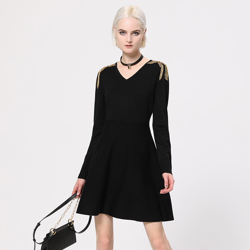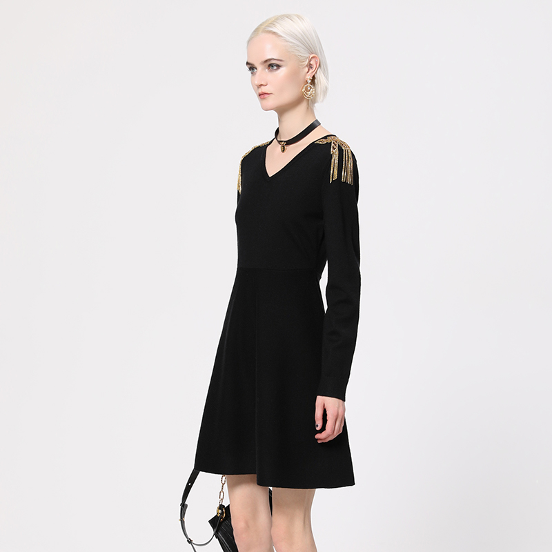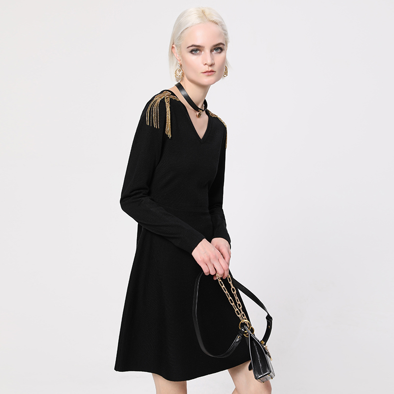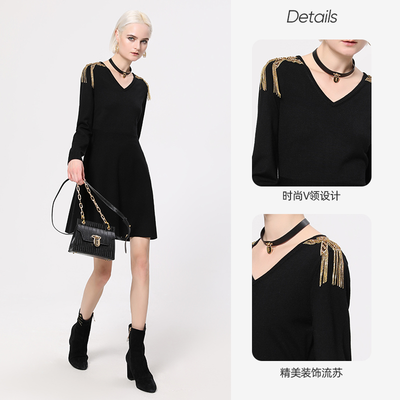 kodice女装夏季新款黑色金属流苏V领摆连衣裙长袖A字裙针织裙子