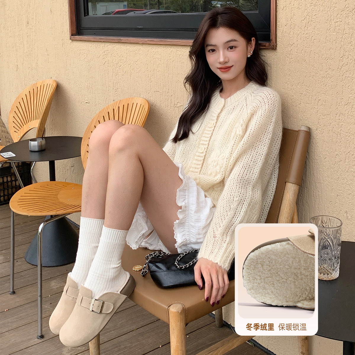 骆驼勃肯鞋女鞋2025新款真皮加绒单鞋懒人一脚蹬包头拖鞋穆勒半拖