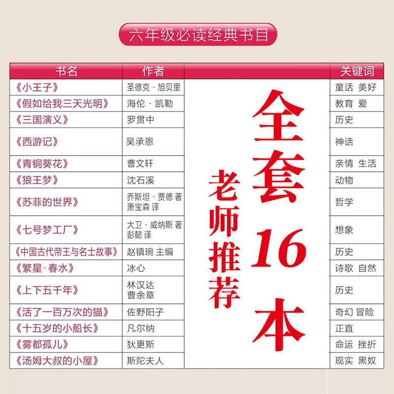 六年级必读经典书目全套16本课外书老师推荐上册下册阅读书籍小王子青铜葵花狼王梦七号梦工厂繁星春水十五岁的小船长雾都孤儿正版