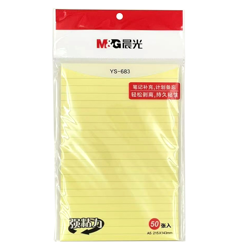 正品晨光A5大号记事贴强粘性学生笔记优事贴50张ys683黄色白色N次随意便签贴A5大张横线系列可撕笔记自粘贴