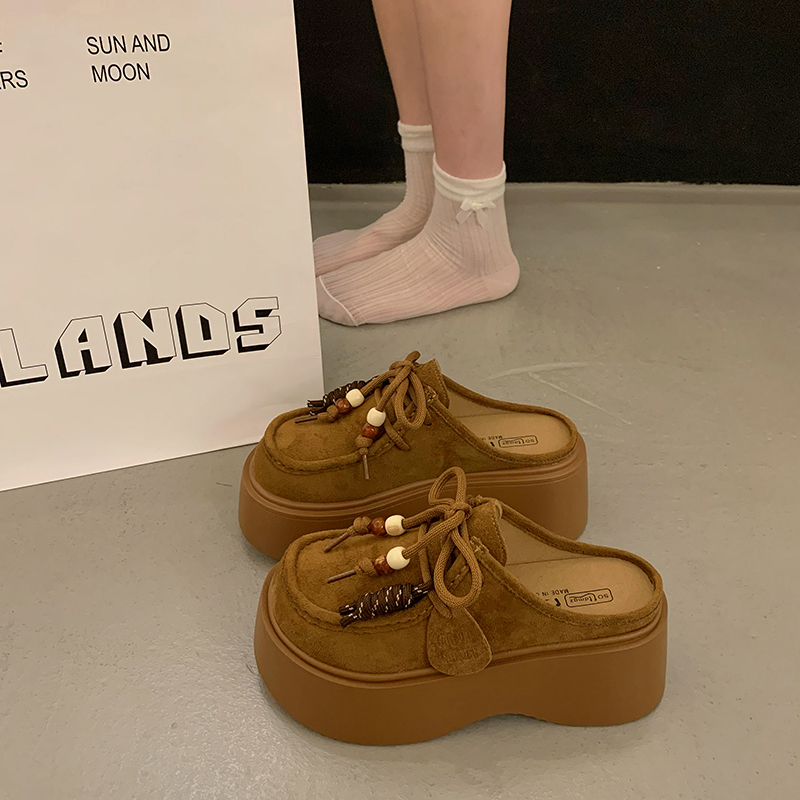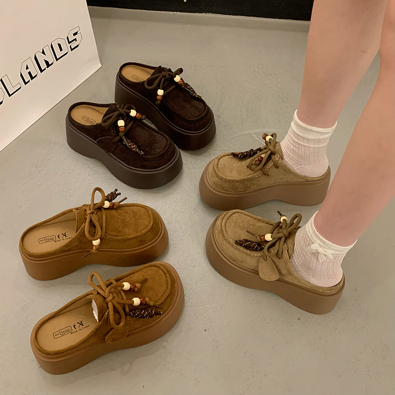 矮子乐勃肯鞋包头半拖鞋女外穿2025早秋季新款复古厚底增高袋鼠鞋