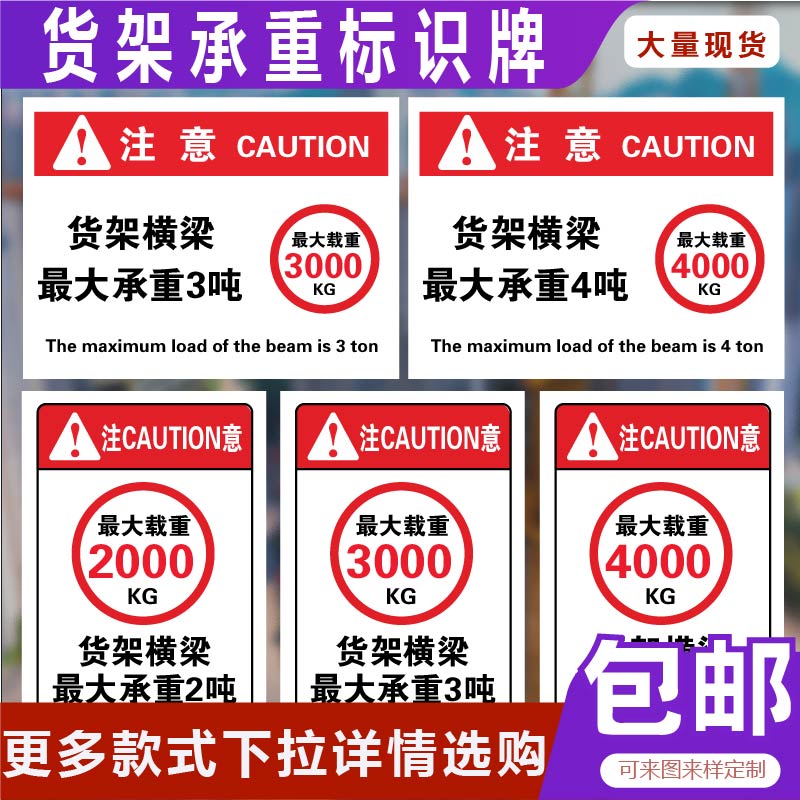 货架承重标识牌标识贴PP背胶贴纸货架横梁载重平台承重限载提示牌车间仓库电梯最大限重1吨铭牌标识牌定制
