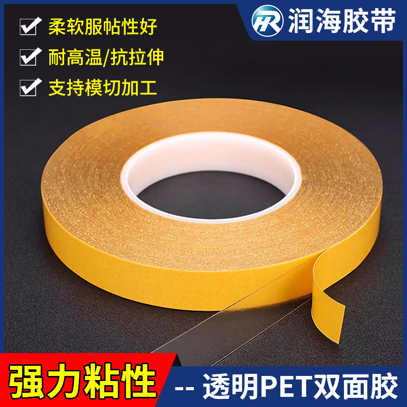 润海0.05mm厚耐高温PET双面胶带黄纸透明无痕双面胶带批发LED装饰件模组铭牌透明镜片及触摸屏的粘贴固定强粘