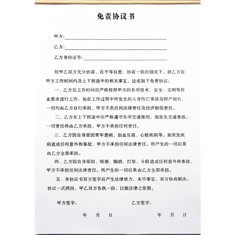 公司员工上下班期间意外免责协议书定制二三联个人安全责任协议书