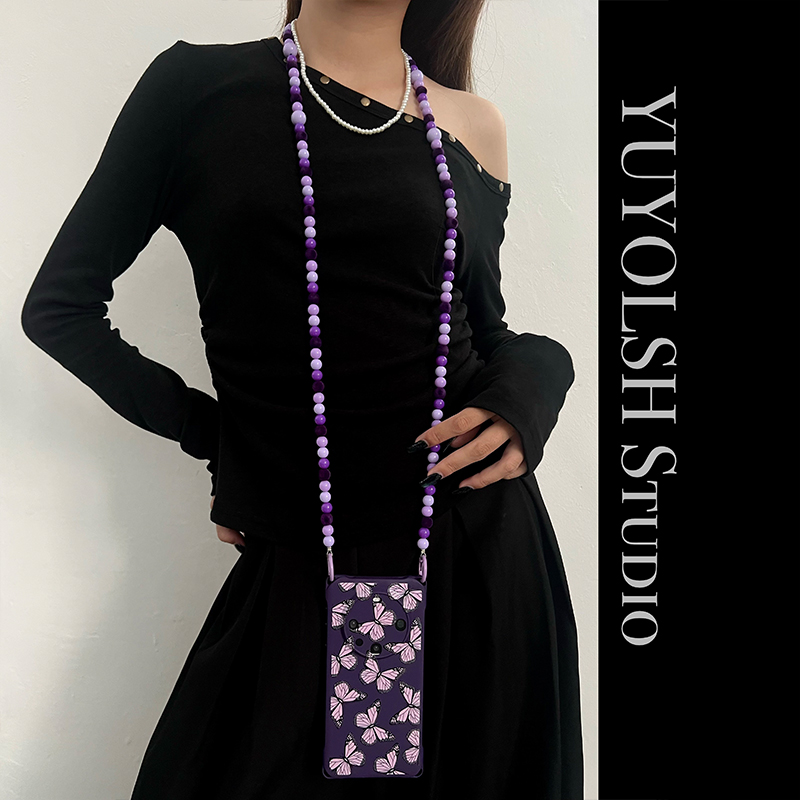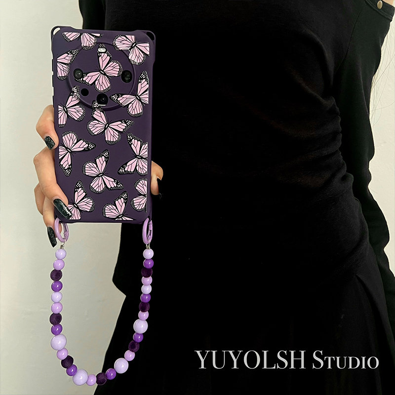 【紫粉蝶舞】原创斜挎植绒链条适用于华为mate70Pro手机壳高级紫vivox200背带斜跨苹果17Pro挂绳magic7小米15
