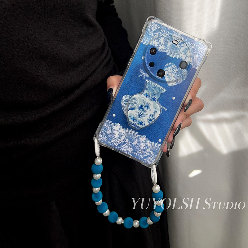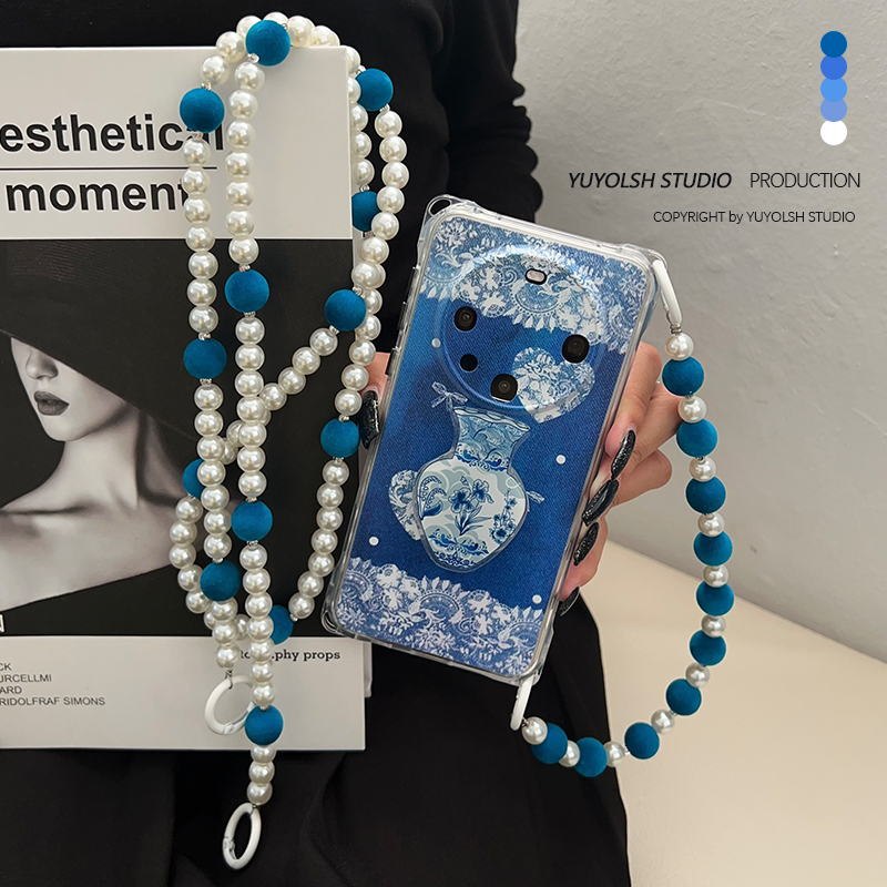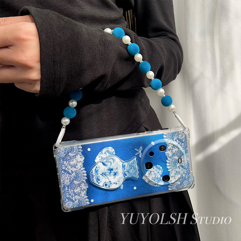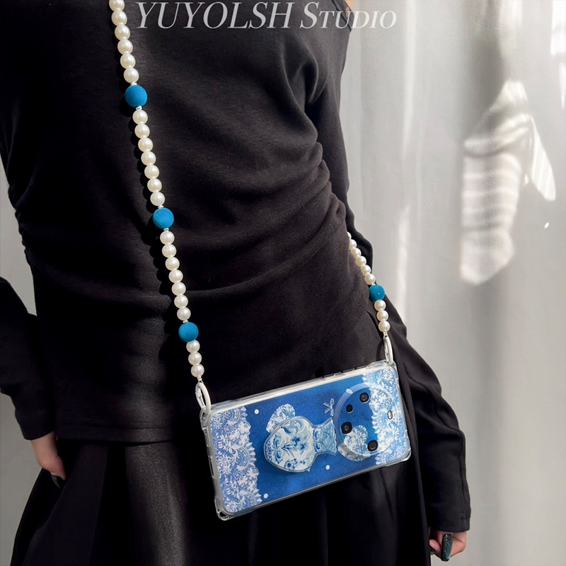 【青花瓷韵】原创斜挎植绒珍珠链条适用于华为mate70Pro手机壳蕾丝爱心小米15背带斜跨苹果17Pro支架秋冬挂绳