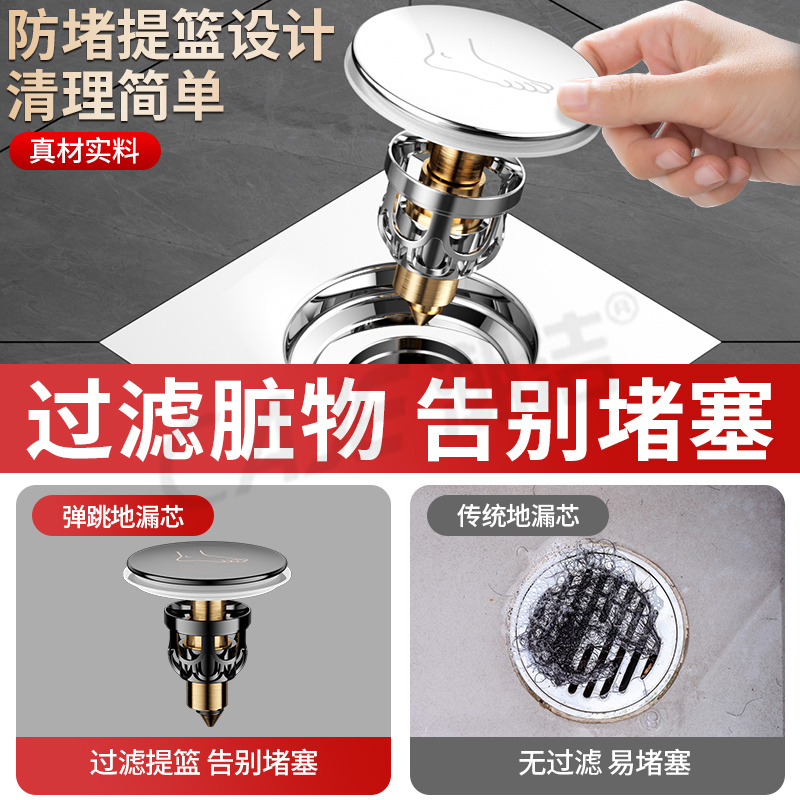 卫生间防臭地漏弹跳芯通用下水道脚踩按压式防返水封闭盖防虫全铜