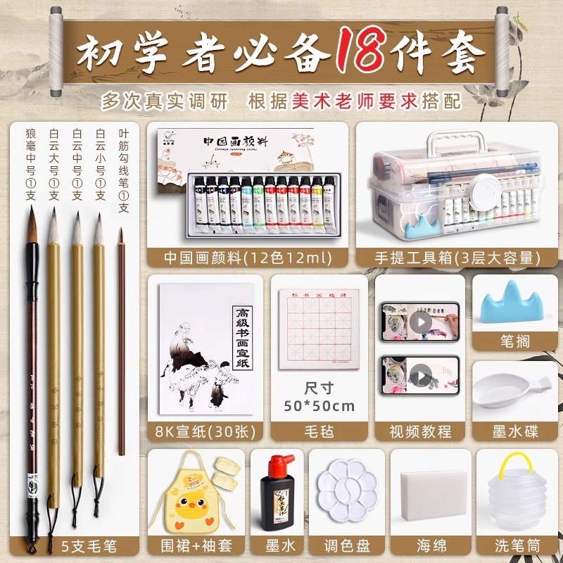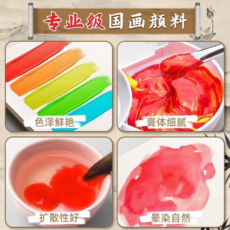 小学生国画颜料初学者套装水墨画中国画用品工具全套12色24色工笔画儿童画画毛笔美术课专用颜料套装全套装